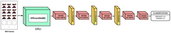 Figure 5 shows the final architecture of the network. As mentioned, transfer learning is applied in the module labeled GRU in Figure 5, where EfficientNetB0 is implemented. The rest of the additional layers are those that are trained to transform the knowledge provided by EfficientNetB0 into a drowsiness level estimation.