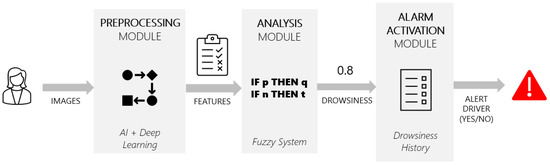 As mentioned in Section 1, this work proposes two alternative solutions to estimate drivers’ drowsiness. The first alternative uses a recurrent and convolutional neural network, while the second one uses AI and deep learning techniques to extract numeric features from images, and then introduces them into a fuzzy logic-based system. However, both solutions follow the same process structure, which consists of three phases: preprocessing, analysis, and alarm activation. Figure 1 shows the three different phases.