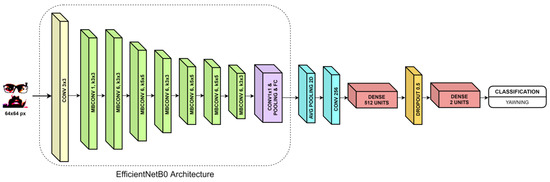 Next, we want to use the face to detect if the driver is yawning. To do this, the face of the driver is cropped and preprocessed following the same process as described in Section 3.1.1. This image is then given as an input to a CNN that we have trained specifically to detect whether a person is yawning or not. This network is based on the EfficientNetB0 model: we use its architecture and its trained weights over the ImageNet domain, and we add new layers to the model to train the network on the detection of the specific actions that we are interested in.
