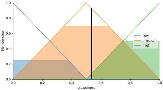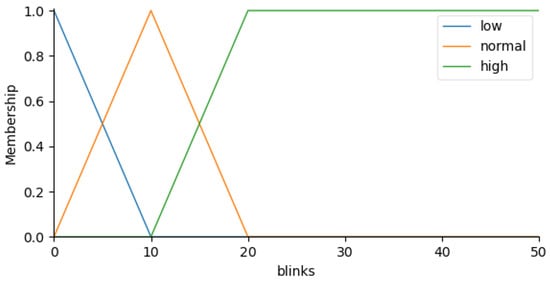 Fuzzy logic uses rules that follow the structure “if p then q”, but, whereas in classical logic p and q can only be or , in fuzzy logic, a statement can be partially true [10]. This is very useful when handling imprecise or rough information, for example, when we are trying to assess if a certain number of blinks means that the driver is blinking slowly or quickly. Since the consequent can also be partially true, this allows the system to estimate the level of drowsiness of the driver instead of only decide whether he or she is fatigued or not, which can help to avoid false positives.