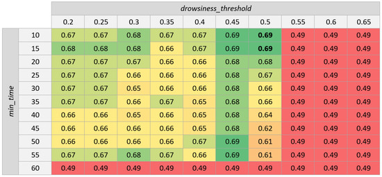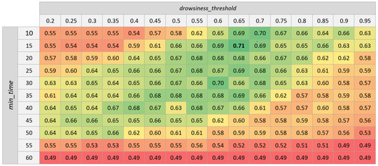 - The driver has to be considered drowsy for multiple instants of the last 60 s to raise an alarm. This is determined by the variable , which represents how many seconds the driver has to be drowsy before alerting him or her. This value ranges between 0 and 60.