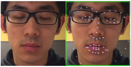 The first step to calculate these parameters is locating the driver’s face. To do this, DLIB’s face detector is used once again. However, in this case, we also use the landmark detector that DLIB provides, which is an implementation of [32], where the shape predictor uses an ensemble of regression trees. DLIB’s landmark detector represents the facial features with a group of 68 points, 12 of them representing the eyes (6 points per eye), which allows us to know the position of the driver’s eyes. Figure 7 shows an example of landmark detection.