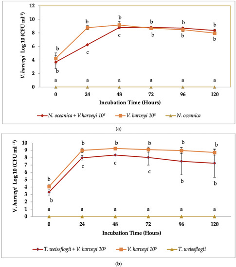 In the co-culture V. harveyi with N. oceanica (Figure 1a), the concentration of V. harveyi was significantly lower (p < 0.05) at 24 to 48 h incubation as compared to control. However, there was no significant difference (p > 0.05) in V. harveyi concentration at 72, 96, and 120 h incubation.
