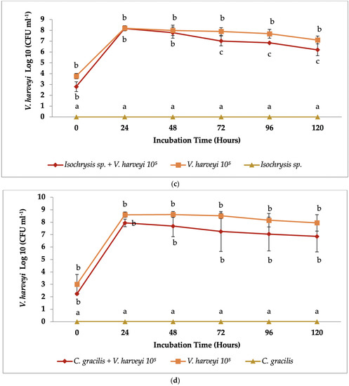 Meanwhile, the co-culture V. harveyi with Isochrysis sp in Figure 1d demonstrated a significantly lower (p < 0.05) concentration of V. harveyi at 72, 96, and 120 h, as compared to the control. In comparison to the control, co-culture V. harveyi with C. gracilis (Figure 1c) exhibited no significant difference (p > 0.05) in V. harveyi concentration. In fact, no bibliographic data on the antibacterial activity of C. gracilis described in the prior study is available. The growth of V. harveyi strains increased steadily with time up to 48 h until reaching a plateaued condition and subsequently decreased insignificantly (p > 0.05) at the end of the experiment in the control group culture with no microalgae added.