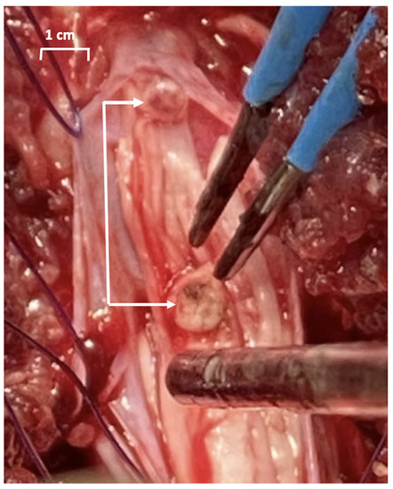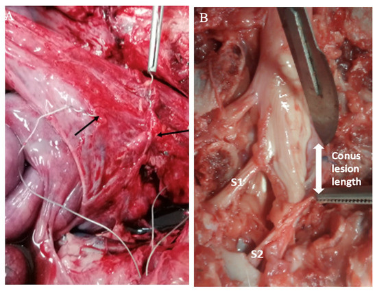 The protocol was approved by the Ethics Committee for Research on Animals of the Banat University of Agricultural Sciences and Veterinary Medicine, Timisoara, Romania (Ethics Committee Approval No. 73/30 January 2019, and Project Approval from Romanian Veterinarian Authority No. 5/5 February 2020). Three healthy Gottingen Minipigs (females, 8 months of age, 20–30 kg; Ellegaard Minipigs, Dalmose, Denmark) were used. Prior to surgery, the minipigs were acclimated for six months to remain in a study cage. General anesthesia was induced as previously described, and a Foley catheter (Ch10, Coloplast, Humlebaek, Denmark was placed [19]. For creating a defined sacral spinal cord lesion, the pigs were placed prone, and after a 15 cm midline incision with the preparation of the dorsal spinal elements, a two-level-laminectomy (L5, L6 and partially S1) was performed, the dura was opened longitudinally and the spinal cord with the lumbosacral roots was exposed. The plan was to achieve a complete sacral spinal cord lesion by resecting the conus medullaris (Figure 2), but it was difficult to assess intraoperatively where the conus medullaris ended and the terminus filum (terminal thread) started.
