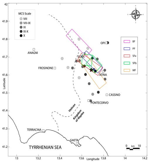 Map of the Mercalli–Cancani–Sieberg (MCS) intensities of the 1654 earthquake. A black star indicates the macroseismic epicenter of the event. The dashed line indicates the border between the two former states of the Vatican (West) and the Kingdom of Naples (East) in the XVII Century, at the time of the earthquake. Colored boxes are the modeled sources: BF, Balsorano fault; PF, Posta-Fibreno fault; SFa, Sora fault from ITHACA Working Group [12]; SFb, Sora fault from Boncio et al. [13]; MF, Macroseismic fault.