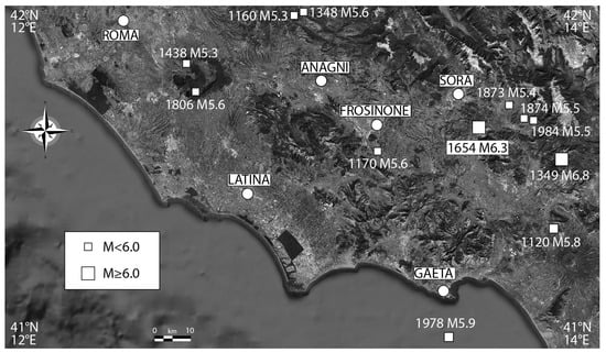 The earthquake hit during the early hours of the 24th of July, producing destructive effects (I = 9–10, M = 6.3) [5] over a vast area of the Southern Latium region between Sora and Cassino and widespread damage on the southern side of the Fucino area (Figure 1 and Figure 2).