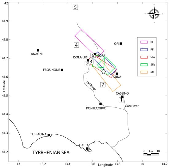 Distribution of the effects of the 1654 earthquake on the natural environment (see Table 1 and text for the description of the effects). Colored boxes are the modeled sources: BF, Balsorano fault; PF, Posta-Fibreno fault; SFa, Sora fault from ITHACA Working Group [12]; SFb, Sora fault from Boncio et al. [13]; MF, Macroseismic fault.