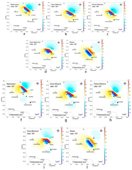 A total of 15 plots of the volumetric strain at the free surface have been computed for the modeled faults, inferring a different sense of slip (Figure 6a–q). Being inferred by inversions of intensity data, the source MF (Figure 6e,l,q) obviously shows a good fit with the map of intensities and the location of the earthquake. However, the performance of the strain modeling of this source is limited, with no agreement between observed hydrological changes and the expected pattern of strain, independent of the style of faulting adopted. Additionally, there is no close association between the location of this source and the distribution of the other effects observed following the earthquake, all located northwest of the fault. When we impose pure normal kinematics to all of the seismogenic sources investigated (Figure 6a–e), we obtain a limited agreement between the predicted pattern of strain and the location of the hydrological changes. In particular, the noticeable increase in discharge of the Gari springs observed in Cassino constantly falls in an area of expected dilatation. Conversely, if we impose a lateral component of the slip on the five sources, we find more satisfactory solutions for data merging. In general, oblique left-lateral sources display a better fit between strain and hydrological signatures; in particular, PF (Figure 6h) and SF (Figure 6g,i) show the best fit for the observations in Cassino (increase in discharge/expected compression) and Isola Liri (decrease in discharge/expected dilatation).