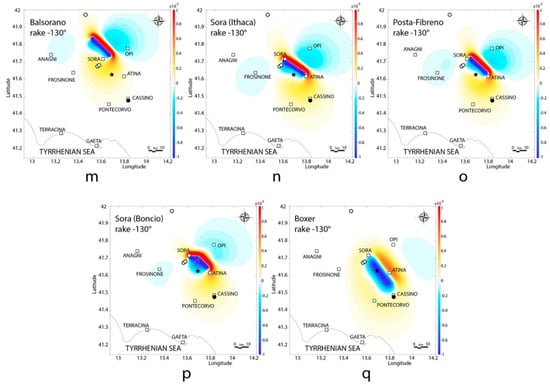 In particular, the coseismic hydrological changes (increase or decrease in the discharge of springs and streamflows, the water level in wells, turbid flow from springs and rivers, and liquefaction) can be a valid alternative method to provide further constraints to estimate (or to confirm related hypotheses) the faulting style of major historical earthquakes of which the seismogenic source is unknown or in dispute, as is the case of the 1654 earthquake. The basic rationale is that such hydrological variations are explained by the coseismic static strain and pore pressure changes predicted by the poroelastic theory, as first proposed by Wakita [24]. Following this theory, an earthquake imposes a coseismic strain field that causes rocks to dilate or contract; the opening or closing of saturated cracks in rocks result in decreases or increases in the ground water discharge from springs and streams. The amplitude of the hydrological changes is proportional to the volumetric strain field, so that the groundwater discharge increases in areas that contract and decreases in areas that extend. Following this rationale, in recent decades, the character of the coseismic hydrological changes has often been found to be related to the style of faulting (Cucci [25] and references therein). The most important caveat regarding the use of hydrological changes in this kind of study is that local precipitation can influence the effect that is observed and it must be carefully investigated. In the case of the 1654 earthquake, the available reports confirm the absence of rainfall in the days preceding the event, which is reasonable as the earthquake occurred at the end of July—the driest period in peninsular Italy. For a complete review of the application and of the limits of this theory in seismogenic studies, see Cucci [25]. It is possible now to perform the calculations of the coseismic strain for the 1654 earthquake produced by the potential sources listed in Table 1 to verify the best fault solution fitting with the observed hydrological and geological effects. The static strain change induced by an earthquake can be calculated using a fault dislocation model. The calculations of the strain were made in an elastic half-space with uniform isotropic elastic properties following Okada [26], and using Coulomb 3.4 [27,28]. In particular, we investigated the deformation imposed by the BF, SFa, and PF [12] and by the Sora fault as proposed by Boncio et al. [13], referred to as SFb. The fifth modeled source (macroseismic fault, referred as MF) is derived from Boxer 4.0 [7], a code that computes the quantitative parameters of earthquakes from the inversion of macroseismic intensity data, which is routinely used for the parametrization of the historical events of the Catalogue. The considered faults are generally reported by the authors with dip–slip to normal–oblique kinematics; this is also confirmed by the focal mechanisms displayed in Figure 4. Thus, we first performed our modeling on pure normal sources (rake −90°, Figure 6a–e); then, a second round of calculation was carried out considering left-lateral oblique slip (rake −50°, Figure 6f–i,l). Finally, we tested the strain calculations on a set of normal sources with oblique right-lateral slip component (rake −130°, Figure 6m–q). The outputs of our calculations are plots of the volumetric strain at the free surface on the five selected individual sources; the plots are shown in Figure 6. We expect to find an increase in discharge in areas of compressional strain and a decrease in discharge in areas of dilatational strain.