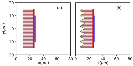 Our study aims to further improve the laser absorption and hot electron generation in a nano-structured target, by tailoring its front surface to modulated geometries [30]. This novel target, known as a corrugated nanowire target (CNT) originates from a planar nanowire target (PNT) and its structure resembles that of the PNT, except that its front surface is tailored so it has a corrugated profile, as shown in Figure 1. Compared to the PNT, the CNT has a larger interaction surface, and more electrons can interact with the laser pulse at the region near the front surface. Furthermore, the laser pulse is obliquely incident in each cavity of the tailored front surface in contrast to its normal incidence in the PNT. This benefits the laser plasma interaction by vacuum heating [25], leading to additional heating of electrons. The oblique incidence also creates multi-reflections of the laser pulse in the tailored structure, meaning that the reflectivity of the laser pulse can be suppressed and more energies are coupled to hot electrons. Here, a series of two-dimensional (2D) particle-in-cell (PIC) simulations were carried out to compare the CNT and the PNT. The simulation results verified that the CNT can significantly enhance the cut-off energies of accelerated protons as well as the energy conversion efficiency. Furthermore, the influence of the laser intensity and the parameters of the corrugated surface on the proton acceleration were examined and are discussed below. The simulation results demonstrated that the proposed target design works well and is superior to the PNT at various parameters, thus providing a robust and simple scheme to obtain protons of much higher energies without requiring a higher laser intensity.