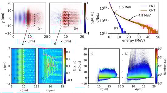 Figure 2 shows the simulation results at . To compare the reflectivity, the normalized Poynting flux in the longitudinal direction () is shown in Figure 2a,b. It can be clearly seen that the reflected component is much weaker in the CNT compared to the PNT. The reflectivity can be estimated by integrating the Poynting flux propagating in the negative direction (blue components in Figure 2a,b, denoted as ) at the left boundary, expressed as , where is the total energy of the incident laser pulse. The value of determines the energy that flows into the target, and the latter corresponds to electron heating and determines the temperature of the electrons. The reflectivity in the PNT is 15%, while in the CNT it is only 5%. This result indicates that in the CNT, more energy is transferred to the electrons in the nanowires, and thus the temperature of the electrons is expected to increase. Furthermore, multiple reflections by the corrugated surface leads to the focusing and reinforcement of the laser pulse in each cavity of the front surface. To better illustrate this, Figure 2d,e show the zoom-in view of at the region near the front surface in Figure 2a,b, and the colormap is also adjusted. It is clearly seen that the intensity of is higher in the CNT, and the peak value of the laser electric field is estimated to increase by 50% comparatively.