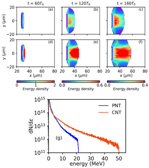 Figure 4a–f shows the energy density (normalized by ) of protons at different times. One can see that the energy densities of accelerated protons are much higher in the CNT. Besides, the accelerated protons propagate faster in the CNT. These results agree well with the above discussion on the sheath field. The energy spectrum of protons at the end of the simulation is exhibited in Figure 4g. The spectra in both cases feature a typical TNSA shape. In the CNT, the cut-off energy of the protons is about 50 MeV, which is much higher than the 22 MeV for the PNT. The proportion of high-energy protons (>5 MeV) is also greatly increased, meaning that more energetic protons are generated in the CNT. To estimate the conversion efficiency from laser to protons, protons with energy greater than 1 MeV were counted, and the laser-to-proton energy conversion efficiency in the CNT was 12.6%, while this value was only 6.7% in the PNT.