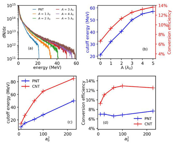 (a) Energy spectra of protons with different . (b) Cut-off energies of protons and conversion efficiency versus . (c,d) Cut-off energies and conversion efficiency versus laser intensity ( ) for the PNT and the CNT, respectively.