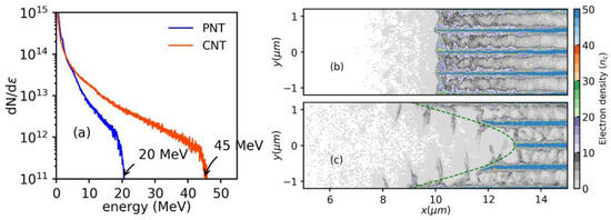 In experimental conditions, the laser pulse usually has a long pre-pulse of low intensity. This pre-pulse can pre-heat the target and generate low density plasmas that fill the gaps between the nanowires, which may impair the laser absorption and hot electron generation. Dozières et al. [29] have studied the effect of pre-pulses on laser absorption and TNSA of nanowire targets by filling the gaps with prescribed low-density plasma. They found that the prescribed plasma can inhibit laser propagation in the nanowires and significantly reduce the proton energy. In the discussions above, the effect of the pre-pulse is not taken into consideration. Here, a set of simulations were carried out to briefly investigate the influence of pre-plasma. The density and profile of the pre-plasma are influenced by many factors such as the contrast of the laser pulse and target material. However, in typical experiments on nanowire targets, the requirement for the contrast of the laser pulse is rather strict, even above 1 [23,39]. For simplicity, we set the density of pre-plasma as and distributed it uniformly in the gaps. The simulation parameters are identical to those introduced in Section 2, except that the gaps are filled with plasma with an electron density of to represent the pre-plasma created by a laser pre-pulse. The energy spectra of the protons at the end of the simulation are shown in Figure 6a. The CNT can still generate much more energetic protons than the PNT. Furthermore, compared to the cases without pre-plasma, the cut-off energies of the protons are only slightly decreased, meaning that the influence of pre-plasma is not significant. This can be understood from the laser propagation in under-critical plasma. The non-relativistic critical density is , while for a laser pulse with large intensity, this value should thus be modified as , where is the relativistic factor [40]. In our case, , and the corresponding relativistic critical density is approximately , much larger than the density of filled pre-plasma. This means that the laser pulse can propagate through the gaps, and the pre-plasma does not have much influence on the absorption. Figure 6b,c present the electron density at , where the main pulse has completely interacted with the target and generated a large volume of hot electrons near the target front. One can see that the generated hot electrons fill in the gaps, and their density is as much as , beyond the relativistic critical density. These electrons play the main role in reflecting the laser pulse, and the pre-plasma is thus negligible.