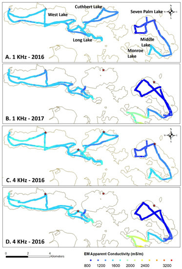 The EM data show a considerable decrease in apparent conductivity between February 2016 and January 2017 in both the Seven Palm and West Lake systems. In the Seven Palm system, the apparent conductivity showed a general decrease of 150 mS/m in the Seven Palm system and 300 mS/m in the Middle Lake (Figure 6A,B). In the Seven Palm system, the 1 KHz apparent conductivity ranged from 800 mS/m at the northern end of Seven Palm Lake to 1400 mS/m at the southern end in February 2016 (Figure 6A), whereas in January 2017, it ranged from 740 to 1200 mS/m (Figure 6B). Similarly, the apparent conductivity along 4 KHz ranged from 870 to 4000 mS/m in 2016 (Figure 6C) to a range of 800 to 2400 mS/m in 2017 (Figure 6D).