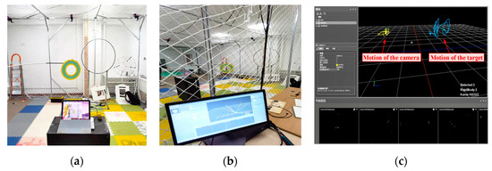 Measurement of indoor environment. (a) Collection environment of datasets, (b) motion-capture system monitoring station perspective, (c) example of the tracking interface of the motion-capture system.