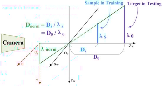 - Since there may be differences between the sample scale and the real target scale in practical applications, similar triangular properties of the projection should be employed to return the depth value to a unified standard, as illustrated in Figure 6.