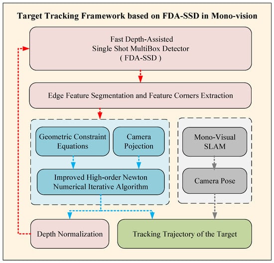 In Section 4, the FDA-SSD model construction with normalized depth information was completed. After the model network was used to obtain the target’s 2D anchor frame, the edge information of the sample and the required characteristic corner points can be obtained following specific needs. Given the target space positioning of geometric constraints, a target-space-tracking framework based on monocular vision was proposed, as shown in Figure 7.