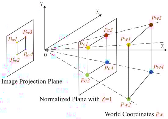 As shown in Figure 8, the coordinates of the target in the world coordinate system were defined as The coordinates in the monocular camera coordinate system were defined as The coordinates of the target in the two-dimensional image coordinate system were defined as The normalized projection points of the normalized plane were defined as The relationship between the image coordinate system and the camera coordinate system can be obtained with the internal reference model of the pinhole camera: