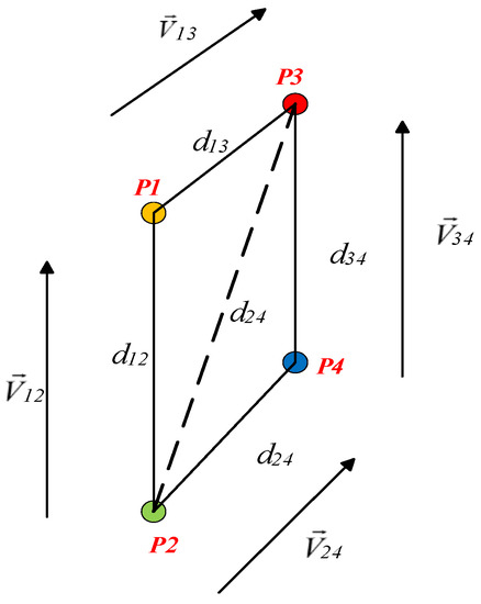 If the target is abstracted as a parallelogram, then a reliable method to construct the constraint equations is presented. As seen in Figure 9, four vertices are given for the parallelogram feature, and six distance constraints and two groups of parallel constraints can be given, among which the distance constraint is:
