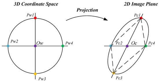 In this study, the method was extended to the solution of circular targets. The properties of the circle projection are that the projection of the circle is a circle or an ellipse, and the projection of the circle is still the center of the projection. The center of the projection-surface image can be obtained with image algorithms. Following the projection properties, the line segment was obtained through the intersection of any two rays at the center, and the graph is radius , as shown in Figure 10. According to the symmetry of the circle, the shape formed by the four intersections must be a parallelogram. Therefore, solving the depth problem essentially returns to the method of solving the parallelogram above.