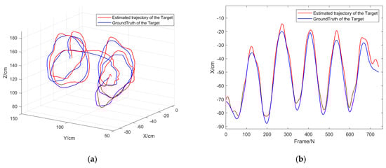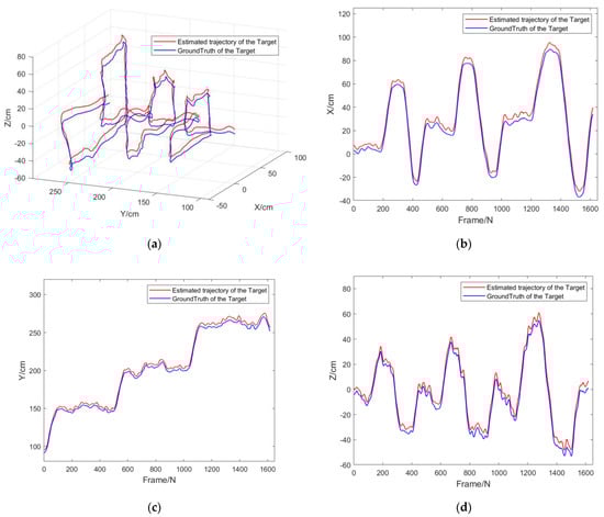 Experiment 2: The purpose of this experiment was to verify the comprehensive performance of the target-tracking algorithm combined with the FDA-SSD detection model for moving target recognition, positioning, and tracking under the static conditions of the camera. In this experiment, the monocular camera was fixed, and the circular grid target moved randomly indoors. The algorithm calculated the spatial-trajectory coordinates of the output target in real-time, which were compared with the measured values of the motion-capture system. The following Figure 13 shows the comparison results of the experimental trajectory.
