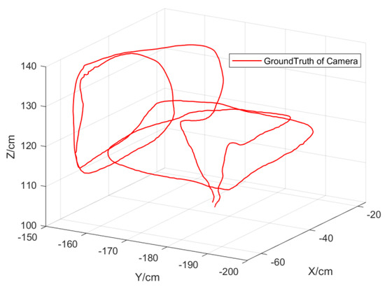 Experiment 3: The purpose of this experiment was to verify the comprehensive performance of the target-tracking algorithm combined with the FDA-SSD detection model for moving target recognition, positioning, and tracking under the condition of camera motion. In this experiment, the monocular camera faced the tracking target and moved randomly, and the rectangular solid-color target moved randomly indoors. The algorithm output the space trajectory coordinates of the target in real-time, which was compared with the measured value of the motion-capture system. Compared with the conditions of the camera in the second experiment, the motion of the monocular camera in this experiment often brought image jitter, resulting in higher requirements for detection. Additionally, the trajectory of the camera was provided by the indoor motion-capture system. The following Figure 14 and Figure 15 show the results of related experimental data.