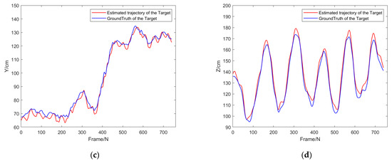 (a) Target tracking results of experiment 3: Comparison of motion trajectories under different depth values, (b) trajectory comparison in x-axis, (c) trajectory comparison in y trajectory comparison in x axis, (d) trajectory comparison in z-axis.