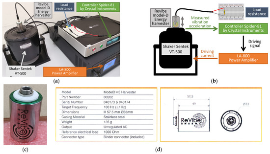 Figure 6a,b, respectively. In particular, the electromagnetic harvester model-D by ReVibe, the photo of which is shown in