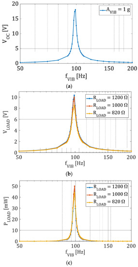 The above measurements allowed us to deduce that the mechanical resonance frequency, i.e., the frequency at which the open-circuit voltage reaches the maximum amplitude value, is equal to . Moreover, they allowed us to determine the amplitude of the open-circuit voltage at the resonance frequency, , the open-circuit 3-dB bandwidth, and the optimal load resistance, , which is the resistance that allows the maximum average power extraction at the resonance frequency.