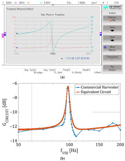 Figure 9b. The comparison shows a very good agreement of the electrical behaviors of the commercial harvester and of the equivalent circuit.