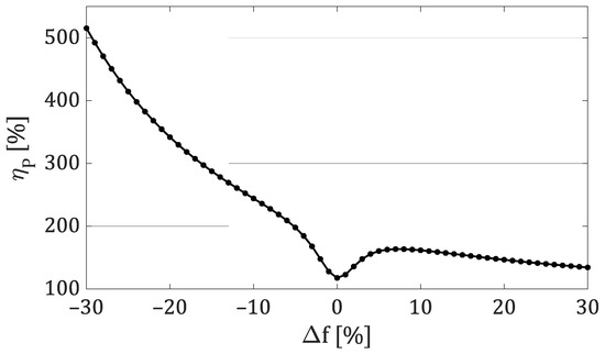 . Therefore, it is possible to define the power gain due to the additional coil as a function of the frequency displacement from the resonance frequency