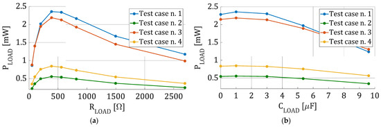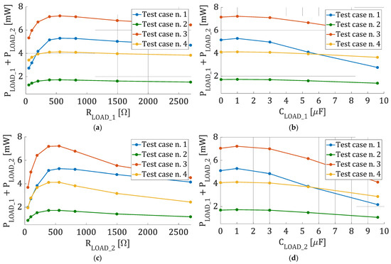 Figure 12a,b, confirm the ohmic-capacitive nature of the optimal load. For all the four test cases, the trends of the measured average load power of the single coil circuit are reported in