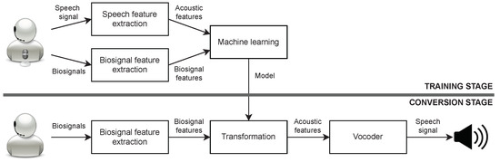 Block diagram of a typical (data-driven) direct synthesis technique. In training stage, a machine learning model is estimated, which represents relationship between feature vectors extracted from speech and nonspeech signals. This model is latter used in conversion stage to predict speech (acoustic) parameters from biosignals.