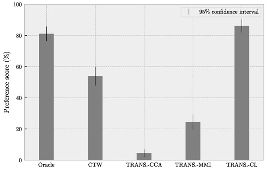 Figure 3 shows the results of the listening test. The most preferred system by a large margin was our algorithm TRANSIENCE using the CL function, being this system on par with the Oracle system. Similar to the triplet loss used in applications such as face or voice biometrics [41,42], we speculate that the CL loss function allows for a more precise way to measure the similarity between pairs of latent vectors sampled from different views and, hence, to more accurately training the DNNs used by our algorithm.