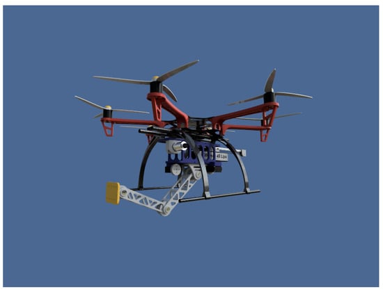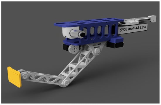 The design of the manipulator consists of a 3 DoF open chain serial manipulator mounted under an extended platform below the drone []. The platform holds the counterbalance system which compensates for the shift in CoG as the manipulator is operating. This platform allows the workspace of the manipulator to be significantly increased when compared to other configurations. One of the main features of the proposed design is that all the actuators are mounted at the base to prevent the increase in the moving mass of the manipulator when it is in motion. The actuators control the manipulator links through a pulley and cable system, allowing them to be placed away from the links [,]. This provides the advantage of having lighter links and a reduced actuator size, as they do not need as much power to operate. The conceptual design in Figure 3 provides a base model to work from to create the detailed model which includes the components necessary to fabricate and assemble the system.