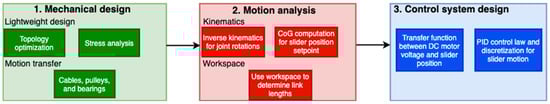 The overall design plan, outlining the processes used to build and test the aerial manipulator with a CoG compensation mechanism, is shown in Figure 2. The purpose of the mechanical design is to ensure the structurally stable design of the manipulator and the slider mechanism while minimizing the overall weight and complexity. A motion analysis of the manipulator is then conducted for two reasons: to identify a large enough workspace region in which the slider mechanism can successfully compensate for the CoG shift, and to use the robot kinematics to determine the slider position that will be fed to a motion controller to compensate for motion. Finally, the control system design is to facilitate the motion of the slider.