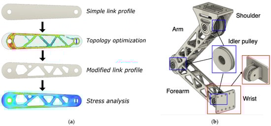 The links are designed through a topology optimization method. Topology optimization is a form of structural optimization in which the material distribution and geometry are used to minimize costs, such as its minimal weight, stress, and displacement, as well as to maximize stiffness []. It does so while ensuring that the design constraints, in the form of multiple static loads applied to the structure, are met, and the various methods are available and applied commercially [].
