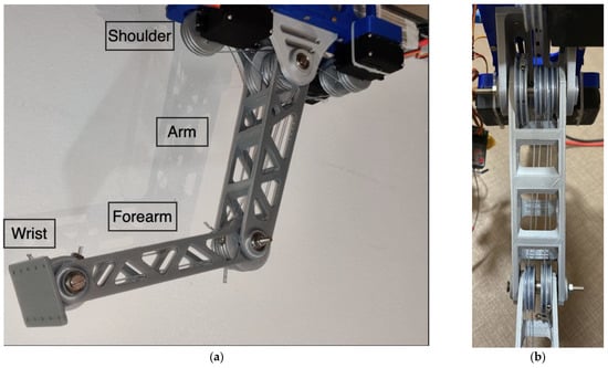 The cable system consists of cables passing through the hollowed-out links and pulleys at the joint. It facilitates the joint rotations and reduces the motor torque required to rotate the joints. The pulley of the arm operates with a mechanical advantage of 1.5 at a ratio of 3:2, with the actuator rotating 3 times to turn the link 2 times. This limits the motion of the arm to 120 degrees, as the servo motors rotate up to 180 degrees. The pulley of the forearm operates with a ratio of 7:6 with the actuator rotating 7 times to turn the link 6 times, giving a mechanical advantage of 1.16. This limits the motion of the forearm to 154 degrees when the servo motor turns 180 degrees. Idler pulleys are also attached to each joint for a continuous cable connection, as shown in Figure 4.