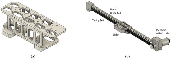 The CoG compensation system consists of a linear guide rail coupled with a DC motor, which is used to drive a slider using a timing belt mechanism. Figure 11 shows a schematic of the CoG compensation system, based on belt-drive models such as in [].