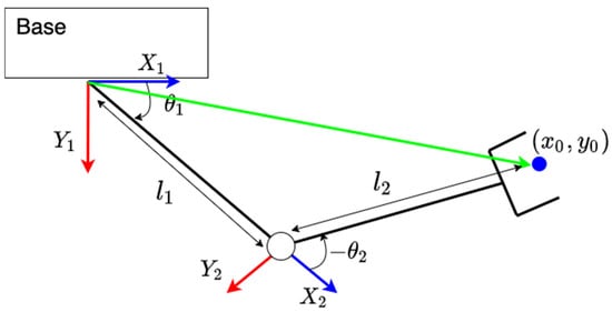 Our design focuses on minimizing the CoG shift. The low power servo motors, the low operational speeds, and the lightweight design led to the assumption that torques created by actuation and inertial movement are negligible. Furthermore, the system design inherently balances the created torques by moving the counterbalance mechanism in an opposite direction to the manipulator. Thus, the created forces can be taken as disturbances cancelled out by the UAV’s stabilization system. As a result of the physical design, the manipulator undergoes planar motion, with the 3D rotation controlled by the UAV’s movement and rotation. To match the Denavit–Hartenberg (D-H) parameters and the inverse kinematic equations [], the notations in Figure 8 are introduced.
