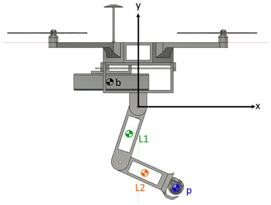 where represent the payload coordinates, the link angles, and the link lengths. Another angle, , was defined to account for the limits of the actuation mechanism. This angle measures the angle of link 2 relative to the drone axis, rather than link 1. It is equivalent to the sum of and .