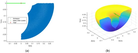 The planar workspace is defined as the total 2D area that the manipulator can reach given a set of angle limits. The angle limits of all links are defined by the physical limitations of the design []. is limited from −120° to −10° as derived from the physical interference limits of link 1. is limited from 0° to 140° as derived from the physical interference limits of link 2. is limited from −90° to −13° as derived from the physical limits of the servo motor actuating link 2. By adding an additional DoF from the drone rotor rotation, the 3D workspace is also computed. The resulting planar and 3D workspaces of all possible end-effector positions within the workspace limits are shown in Figure 10.
