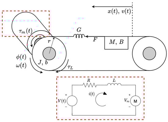 where and represent the mass, viscous friction damping coefficient, and spring constant representing the belt stiffness, respectively. The timing belt is assumed to be rigid and, as such, we set .