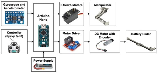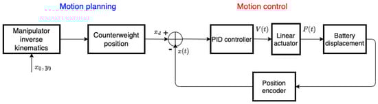 As a result, the center of mass is shifted. The main objective of the control system is to control the slider position correctly. Our intention is to balance the system to ensure the center of mass of the entire system is preserved. When the manipulator moves, a countering moment is added by moving the battery. The block diagram of the closed loop system is shown in Figure 13.