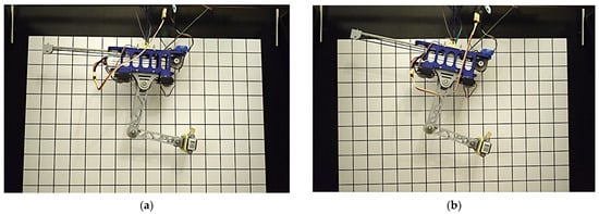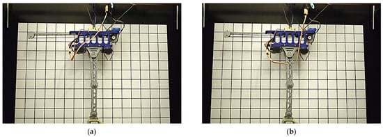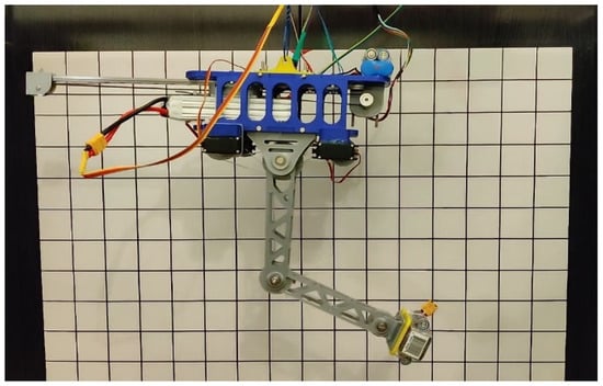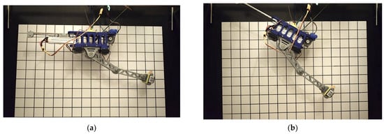 To analyze the effectiveness of the system, the tilt angle evaluation method presented in [] is analyzed by attaching the manipulator to a single pivot point, as in Figure 14. The tilt angle corresponds to the CoG shift, as the CoG is directly under the apparatus pivot point []. During the manipulator’s operation, an MPU-6050 gyro and accelerometer sensor is used to measure the system’s tilt angle []. All data is collected directly through the Arduino microcontroller serial port.