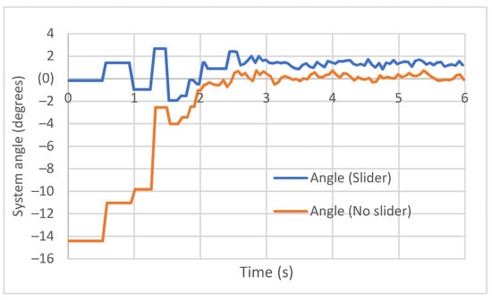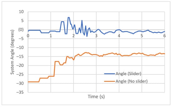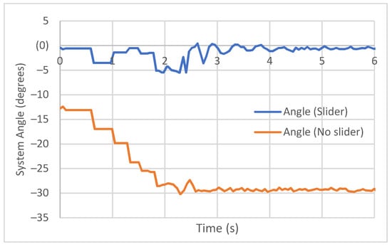 Figure 16 shows the system tilt angle at the coordinates (0, −0.29), with and without the slider.