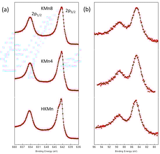 Analysis of the 3s region is more useful to assess the oxidation state of manganese, due to mainly the exchange interaction between the 3s and 3d electrons [,]. The 3s splitting (Table 2) suggests that the samples have a Mn3+ and Mn4+ mixture. The values of Mn average oxidation state in KMn4, KMn8 and HKMn are gathered in Table 2 and were obtained as suggested by Beyreuther at al. [] taking into account the doublet separation from Equation (1).