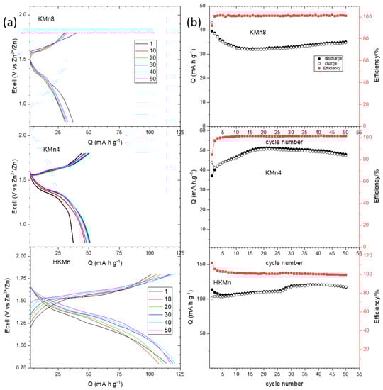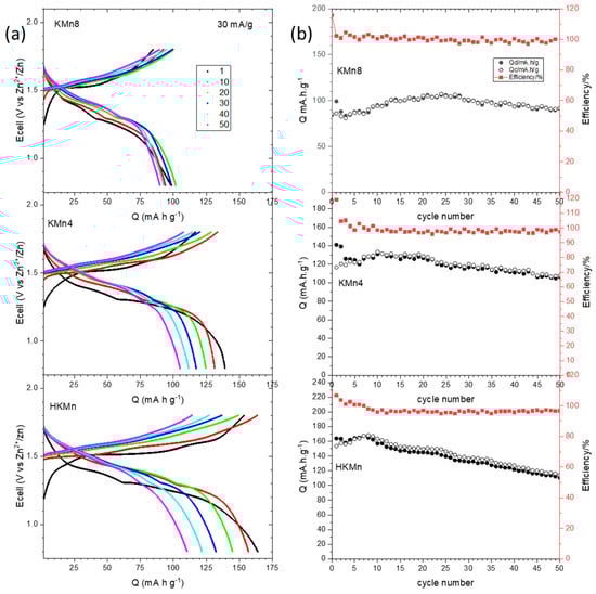 (a) Charge–discharge profiles at 30 mA g−1 and (b) specific capacity and efficiency for KMn8, KMn4 and HKMn during 50 cycles.